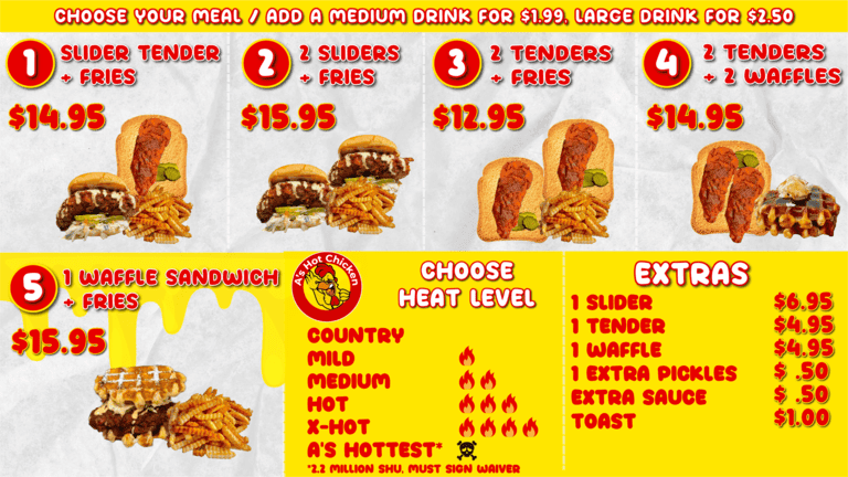 Welcome to A's Hot Chicken, a must-visit destination for fried chicken enthusiasts in Fresno, CA. Nestled at 6460 N Blackstone Ave, this vibrant eatery boasts a menu packed with flavorful options that highlight their signature chicken. Customers rave about the juicy tenders and sliders, particularly the crispy exterior and the range of spice levels tailored to every palate.